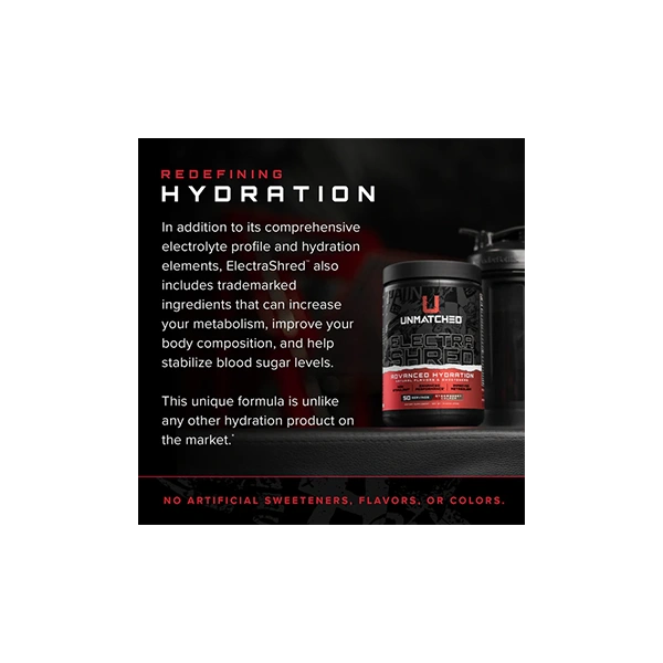 Introducing ElectraShred, your ultimate hydration solution for peak performance and vitality. Formulated with a commitment to quality and innovation, ElectraShred is more than just a hydration supplement—it’s a game-changer in your fitness journey. Crafted with naturally flavored and sweetened ingredients, ElectraShred delivers a refreshing burst of hydration without any artificial additives or fillers. With a precise blend of electrolytes sourced from premium sources and carefully dosed to optimize hydration, ElectraShred replenishes essential minerals lost during intense workouts or daily activities. But what sets ElectraShred apart are its unique ingredients, including Chromax®, Phytoserv®, and Ioniplex®, which work synergistically to support hydration, energy, and overall wellness. Get ready to elevate your hydration game with ElectraShred.
