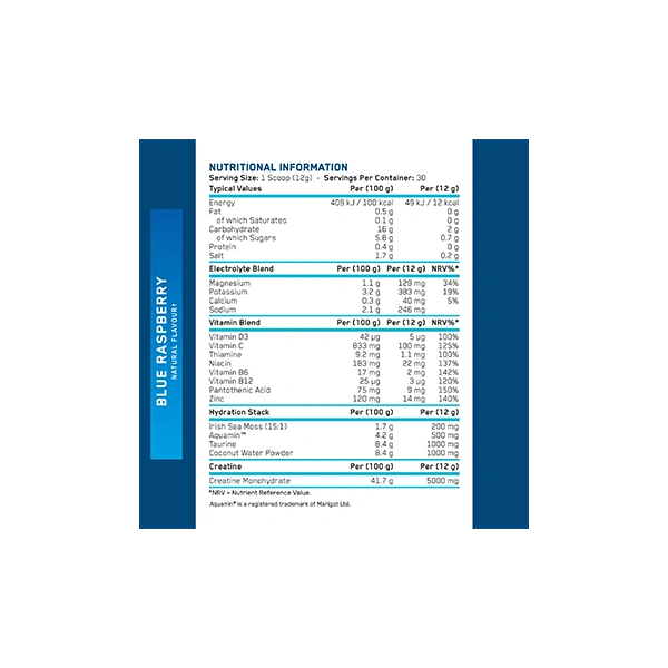 توفر كل جرعة 5 جرام من الكرياتين أحادي الهيدرات، المعروف ليس فقط بتأثيره على أداء العضلات ولكن أيضًا بفوائده الأوسع نطاقًا على الوظائف البدنية. لتحسين الترطيب، تحتوي التركيبة على 500 مجم من Aquamin – مصدر غني بالمعادن البحرية إلى جانب مسحوق ماء جوز الهند الغني بالبوتاسيوم، ومستخلص الطحالب البحرية الأيرلندية، والتوراين لتعزيز ترطيب الخلايا.