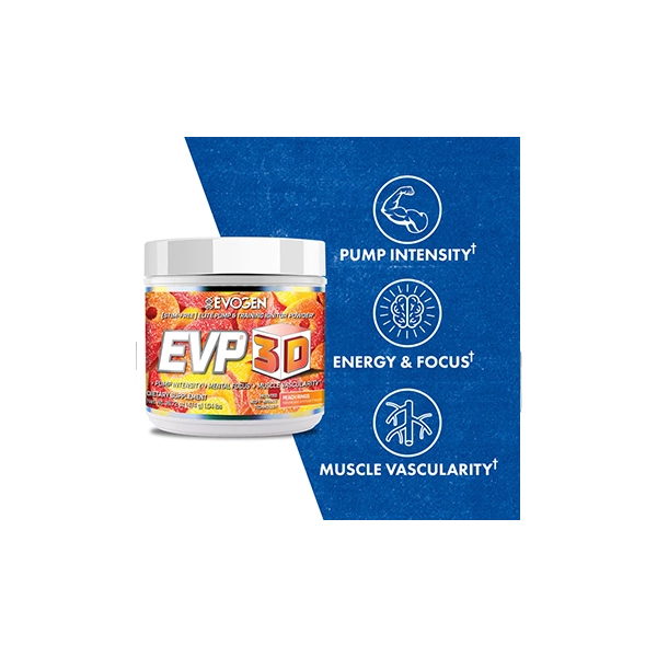 EVP 3D هو مكمل غذائي متطور مصمم خصيصًا لتعزيز أداء الرياضيين والمحترفين في مجال اللياقة البدنية. هذا المنتج المبتكر يوفر مزيجًا قويًا من المكونات النشطة التي تعمل معًا لتقديم دفعة قوية من الطاقة والتركيز، وتحسين تدفق الدم إلى العضلات، مما يساعدك على تحقيق أقصى استفادة من تمارينك.