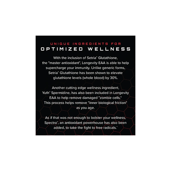 LONGEVITY EAA هو مكمل غذائي يحتوي على الأحماض الأمينية الأساسية التي يمكن أن تساعد في بناء العضلات، وتحسين الأداء الرياضي، ودعم الصحة العامة